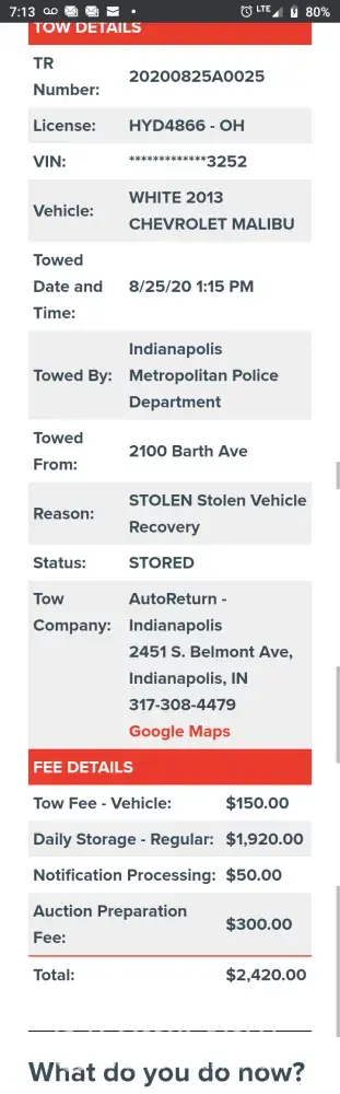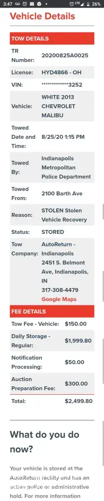 My car was stolen from a hospital in Troy ohio. This happened on 8/20/20. I made a police report. The car was then recovered on 8/25/20 in marion county Indiana. The car was towed to the Autoreturn. They charged 150 for tow, and 30 dollars a day for fees. The car is now over 2500.00 to get back. I have contacted Autoreturn many times to try and negotiate...