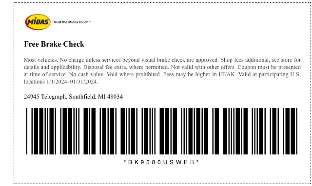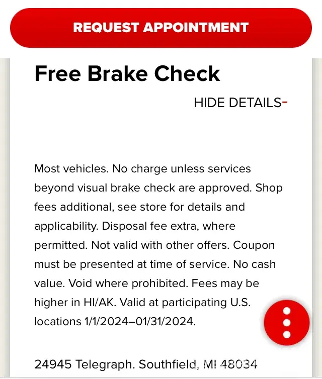 On January 26, 2024 I had appointment for rear brakes, I informed the person at the front desk that I had a coupon for a free brake check, he told me I couldn’t use the coupon without a reasonable explanation. I was charged $ 45.00 plus tax. Total cost $52.84. I would like a refund of $52.84 because I feel like the coupon for the brakes and should have been honored. Sincerely, Joanne Carrington