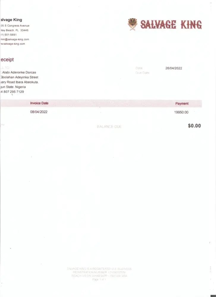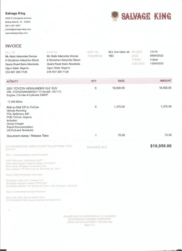 I wish the complaints board will help me recover my money fraudulently obtained by salvage- king .com and Mr. Alexander Rudsky, who is identified as the sole owner/promoter. In April 2022, Salvage King.com advertised and offered to sell to me, a Toyota Highlander 2021 XLE VIN 5STDGZRAHOMS087172 identified as Stock#:087172 on its salvage-king.com...