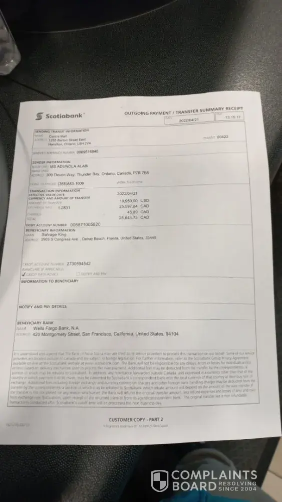 Read full complaintSalvage-King.com / Alexander Rudsky - Toyota highlander purchased but not delivered