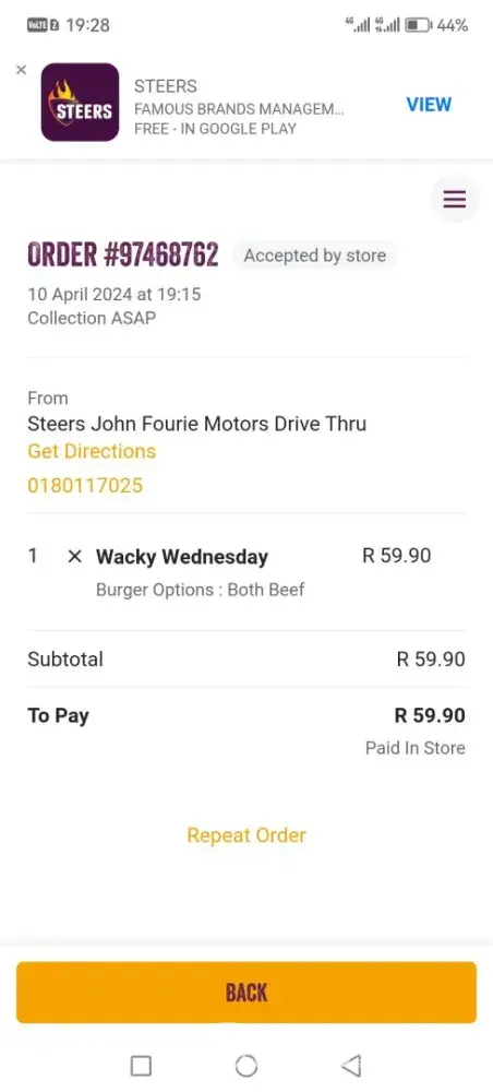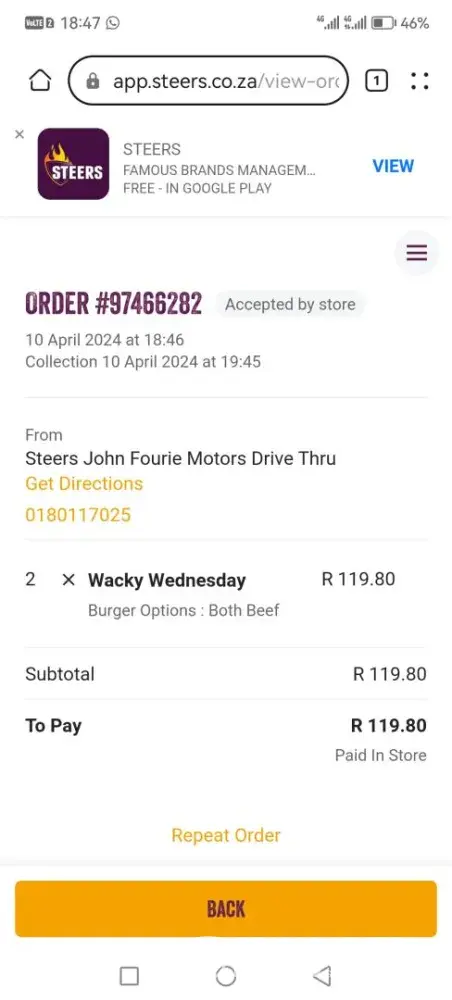 To who ever is reading this. On Wednesday 10 April 2024 @18:45 i ordered 3 Wacky Wednesdays online so that i can just pick it up when i'm done at work @19:30 They processed my orders, even got a email claiming they are working on it. when i got there at 19:45 they made me wait where all the other customers where waiting also getting angry when one of the...