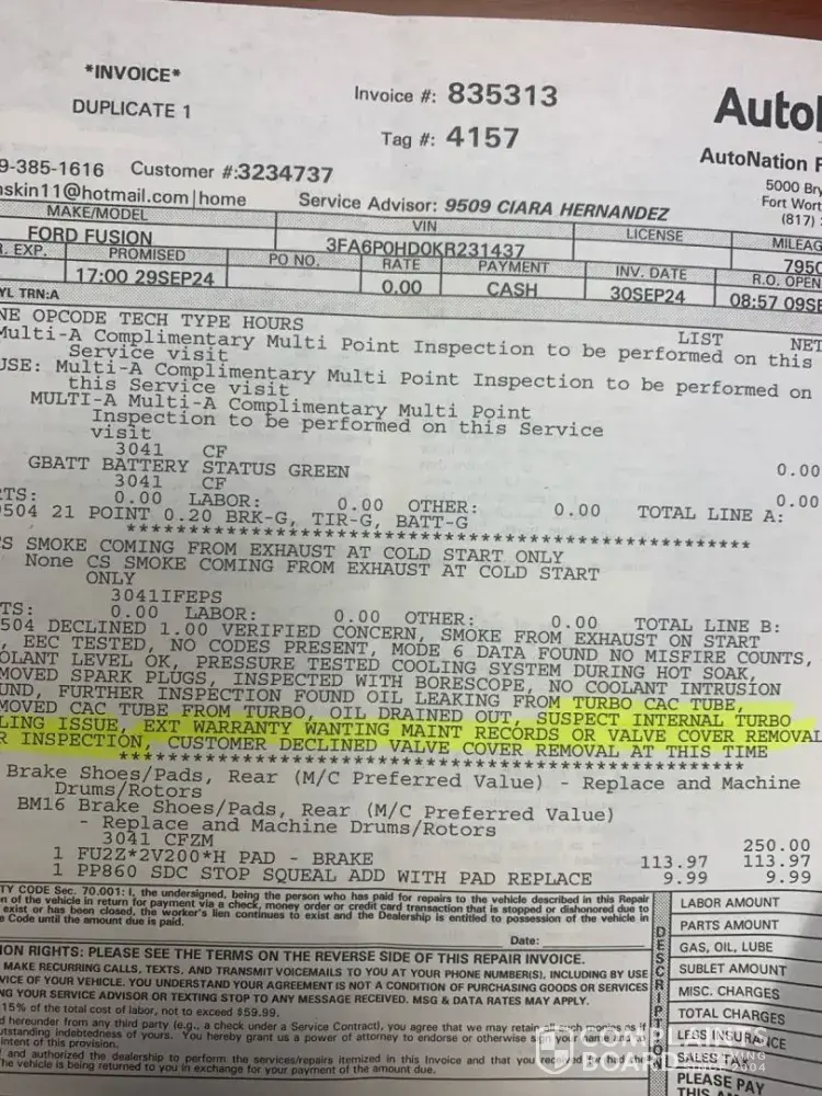 Purchased 2019 ford fusion in 2018 2,000 miles with platinum warranty up to 100,000 miles, 10/2024 smoke came out exhaust tail pipe on morning start up only then quickly evaporating, took up to dealership where it stayed for 4 weeks, they wanted me to pay non-refundable $875 to take pictures after telling me it was oil in the turbo valve sitting. I said I...