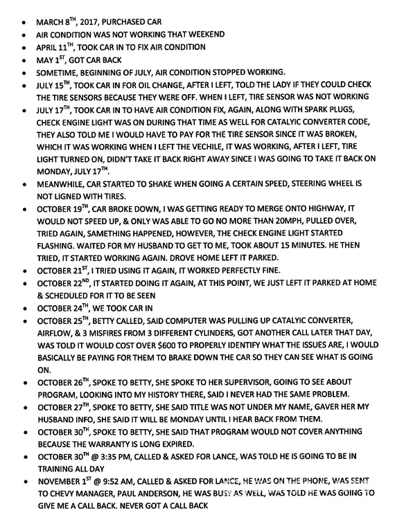 I have had so much trouble with my vehicle. Autonation in Ennis was recently bought by a different dealership. From what I have heard, (could be rumors), the used cars that they had were replaced because they were all bad cars. I can only imagine since I purchased a used car from there with so many problems. I'm attaching a rough draft of an outline that I have been through, I started doing this in October, so anything before that is kind of an ideal dates but close to those dates. I stopped doing it on Dec 26th. So anything after that is ideal dates as well. I only have call records & an invoice from the 2nd to last time I took it in.