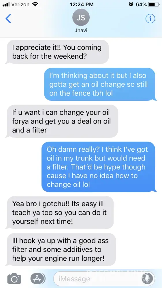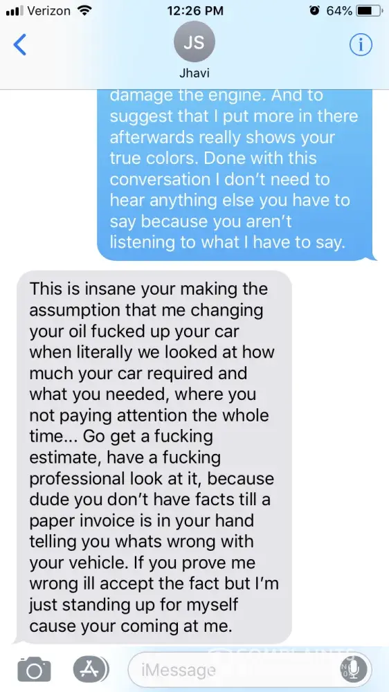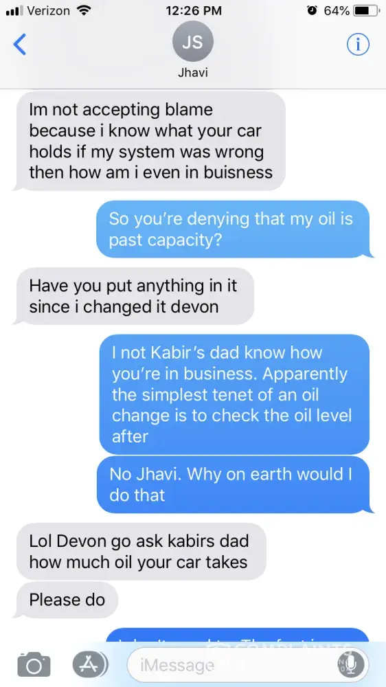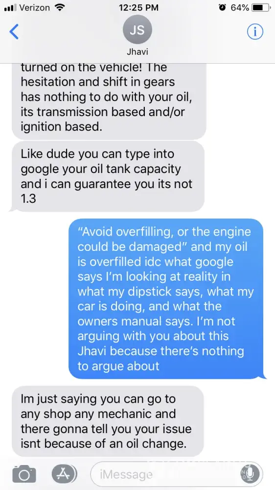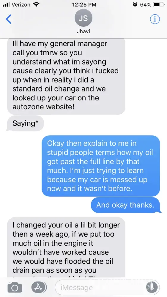 An employee at an auto zone store on East Market Street in Leesburg, Virginia offered his help to me two sundays ago in changing my oil and replacing my oil filter before I went back to school at William & Mary. After leaving the oil change performed solely by Mr. Schatz I noticed a char or almost burning smell when I turned my car on which I wrote off as being part of the 50-100 miles he recommend I run the car to lubricate the engine. Upon getting to school almost 200 miles later the problem was still there so I called my brother-in law who is a mechanic who said to check my fluids when I noticed I was massively overfilled with oil. I had texted Mr. Schatz about it to which I was met with an intensely defensive posturing, name calling, blame and public lies to my peers. I have attached screenshots of our message conversations as well as the dipstick reading and wholeheartedly do not believe autozone believes the manner in which I was dealt with was professional, warranted, or mature. For my character to be attacked by an employee due to me bringing up a specific issue about my vehicle that he had worked on is wholly unacceptable. I hope I can speak with someone further about this and ensure that this isn't the kind of employee you want representing your company.