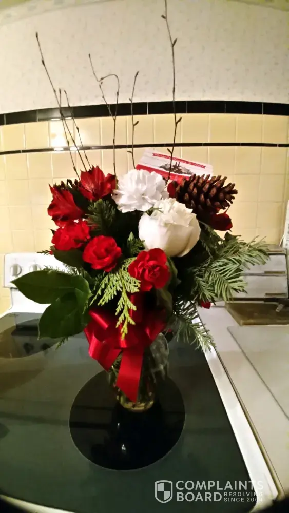 Well, my Godmother received the arrangement and her daughter sent me a picture of what it looked like. OMG - I was so embarrassed! It was DISGUSTING - HORRENDOUS - INSULTING - I didn't even look like a $15 arrangement you could get at a grocery store! Simple arrangement of a rose, carnations, another flower, holly, evergreen, and pine cones.