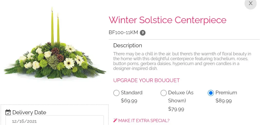 I found a beautiful Christmas Centerpiece at Terry's Flowers [ AVAS ] that I knew she would love. So, I purchased the Winter Solstice Centerpiece (Premium) Price: $89.99 arrangement. First, I was shocked seeing that there was an additional fee of $15.99 as a Service Fee, God only knew what that was for!
