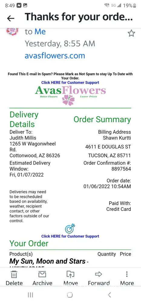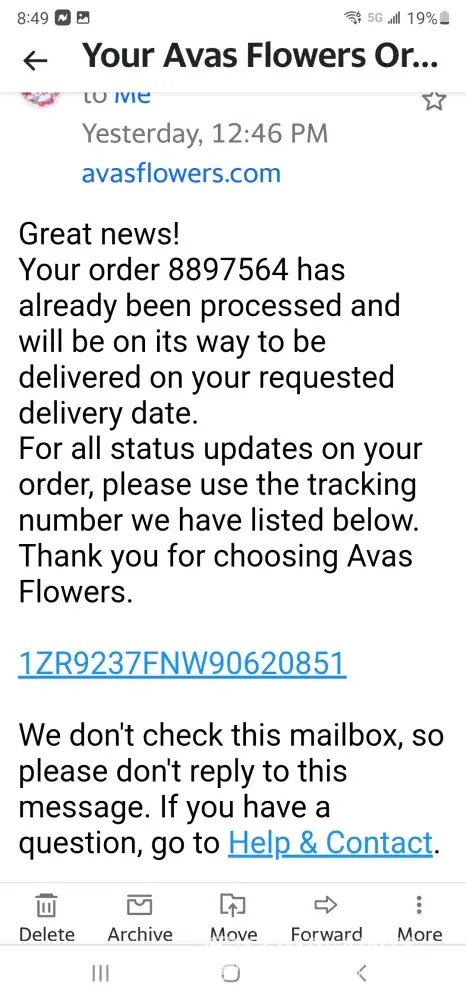 I ordered flowers on 9/27/21 to be delivered on 9/28/21 to my 92 year old mother. Ava Flowers called me on 9/29/21 stating there was a problem with the address. That was resolved and I stressed that I wanted them delivered even a day late. Ava flowers always sends a delivered conformation with my previous orders. I still have no confirmation that they were delivered, and my mother isn't reliable due to her age. I have been unable talk to any customer service person.