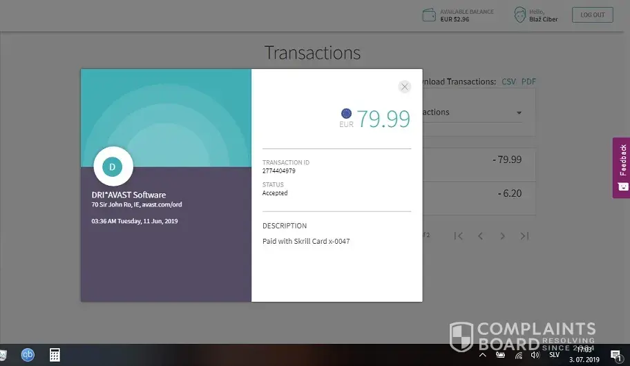On 12/06/2019 my MasterCard at Beobank with the last 4 digits 2000 has been debited with the amount of 59.99 Euros. The receiver is DRI AVAST Software, and the reference of the payment is: "avast com ordIE".
