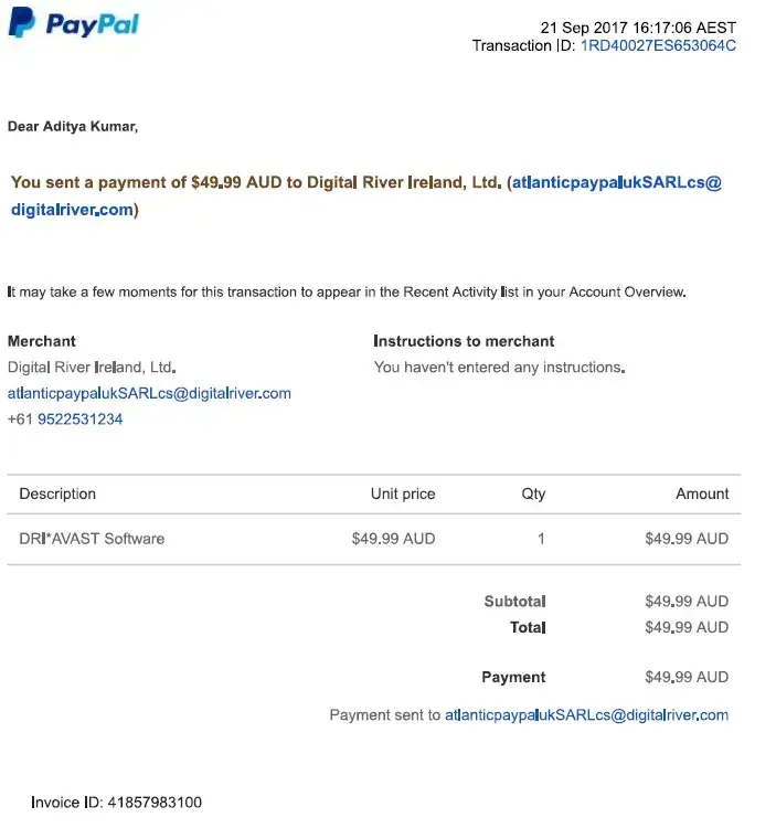 unauthorized paypal account charged $43.69 dri*avast