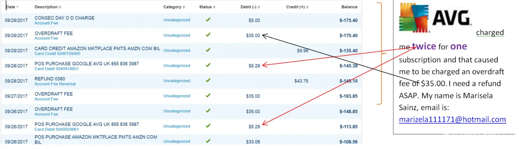 On September 26, I was charged $5.26 which corresponds to my annual AVG membership fee. Then I was charged $5.26 again on September 28. This has caused me an overdraft fee of $35.00. My email is marizela111171@hotmail.com