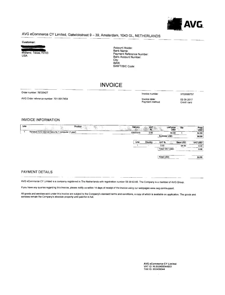 Received email from AVG for an Invoice, Order Confirmation and License, on 9/2/17. We did not make this purchase. The invoice states the payment method is a credit card, but not what type of credit card. The address on the invoice, we have not lived at for over 5 years and have not had any dealings with AVG for that length of time or longer. We aren't sure we ever did. I have checked our banking account and monies have not been debited. Attached is the invoice. Don't do any type of business with the company. Will keep watching bank account and other types of credit cards.