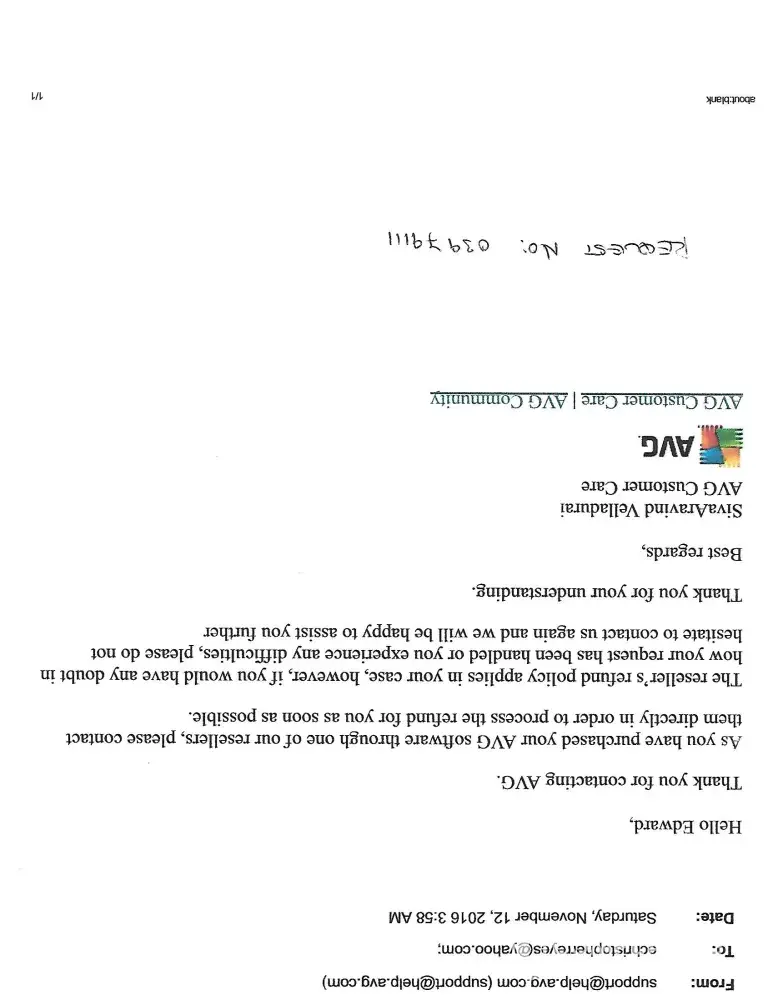 I purchased AVG at Best Buy and was dissatisfied with the product. I contacted AVG [CASE NO. [protected]], and was told that I had to resolve the matter with Best Buy'