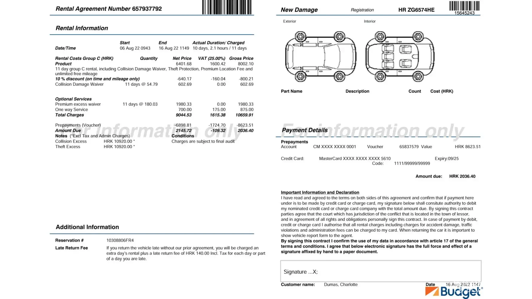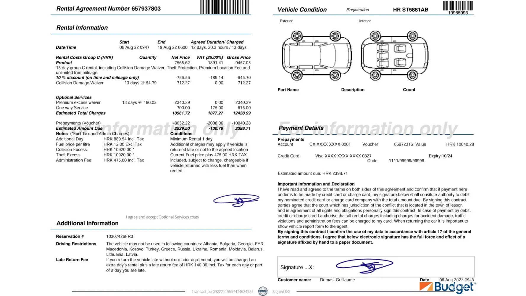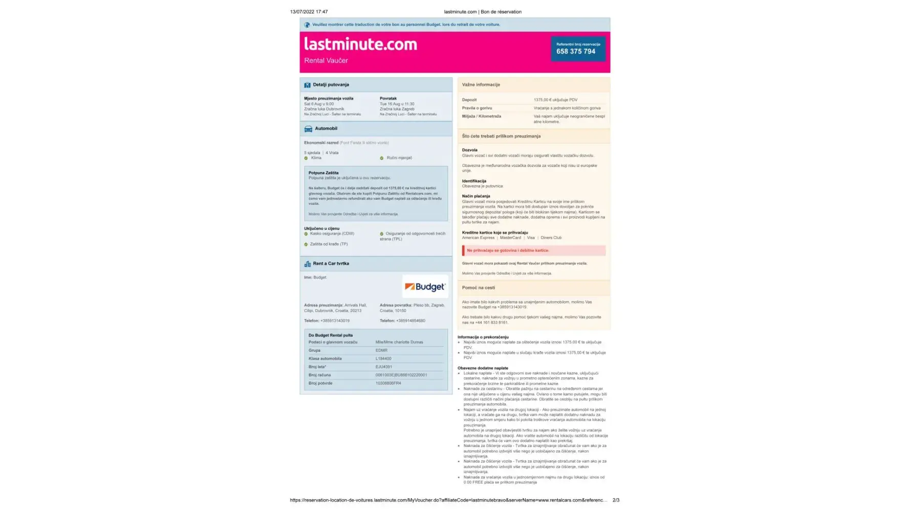 Nous avons loué deux voitures en croatie à Dubrovnik, celle de mon mari, payé environ 1375 € (Référence de réservation [protected]) et celle de ma fille payée 1375 € aussi (Référence de réservation [protected]), à la location nous avons été obligée de signer électriquement un contrat dont on ne connaissait ni les tenants ni les aboutissants étant donné que nous ne parlons pas couramment anglais, j'ai malgré tout bien spécifié que je n'étais s d'accord pour reprendre une assurance car j'en avais déjà souscris une (la vôtre lors de la réservation avec last minute) pensant que l'agence avait bien pris en compte mon refus de prendre leur assurance, nous avons signé, de plus ma carte de crédit prendrait également en charge des dégâts s'il y en avait eu, mais lors de la restitution de la voiture le 16 aout pour ma fille, et e 19 pour nous, personne n'était là à 6 h du matin alors que c'était convenu, ils ont donc inspecté les voitures seuls. Lors de la restitution de la voiture, ces deux dernières étaient rendues dans le même état que lors de la prise en main le 6 aout, nous n'avons subi aucun dommage, tout était en ordre nous n'avons eu aucun sinistre avec les voitures, et pourtant cette agence, Avis Budget Croatie s'est permise deux jours plus tard de nous soutirer 438 € pour mon mari et 273 € pour ma fille sur leurs cartes respectives sans que nous ne soyons informés et surtout sans savoir pour quelle raison ces sommes ont été retirées. Nous n'avons eu à ce jour aucune explication crédible sur ce débit. Il est hors de question que ces voleurs se servent sur notre compte ainsi, c'est scandaleux. Nous demandons le remboursement immédiat de cette somme. Les pratiques de ces entreprises sont honteuses je ne comprends pas comment un état européen peut tolérer ceci. Je leur ai envoyé des mails en les accusant de vol et leur demandant la restitution immédiate des sommes mais rien n'y fait, ils sont intouchables. J'espère que vous allez faire le nécessaire étant donné que j'ai souscrit une assurance chez vous et que si ces malfaiteurs nous ont soutirés de l'argent pour un dommage, vous allez nous rembourser car une assurance sert à cela. Je vous précise qu'il est impossible de vous joindre ni par téléphone, ni par mail, ni par votre site, ça aussi c'est scandaleux..