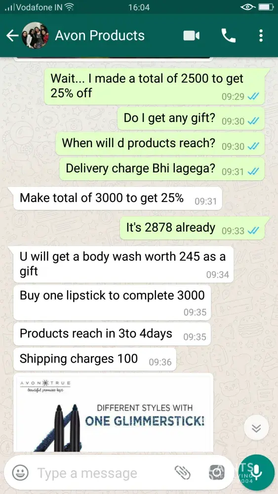 Hi.. This is Bhavya Gangwani from delhi(India)I had a very bad experience with an Avon dealer named Nidhi khanna( delhi-India). She is so annoying... She made fake promise to deliver free gift (Deo) with a purchase above 3000inr...
