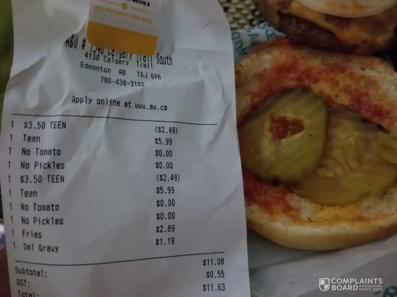 Sunday Sept 23rd at 12:30am I went to the drive thru at 4130 Calgary trail in Edmonton Alberta and bought 2 Teen burgers and asked for no pickles or tomatoes on both, when I got home I found out both had tomatoes and pickles.