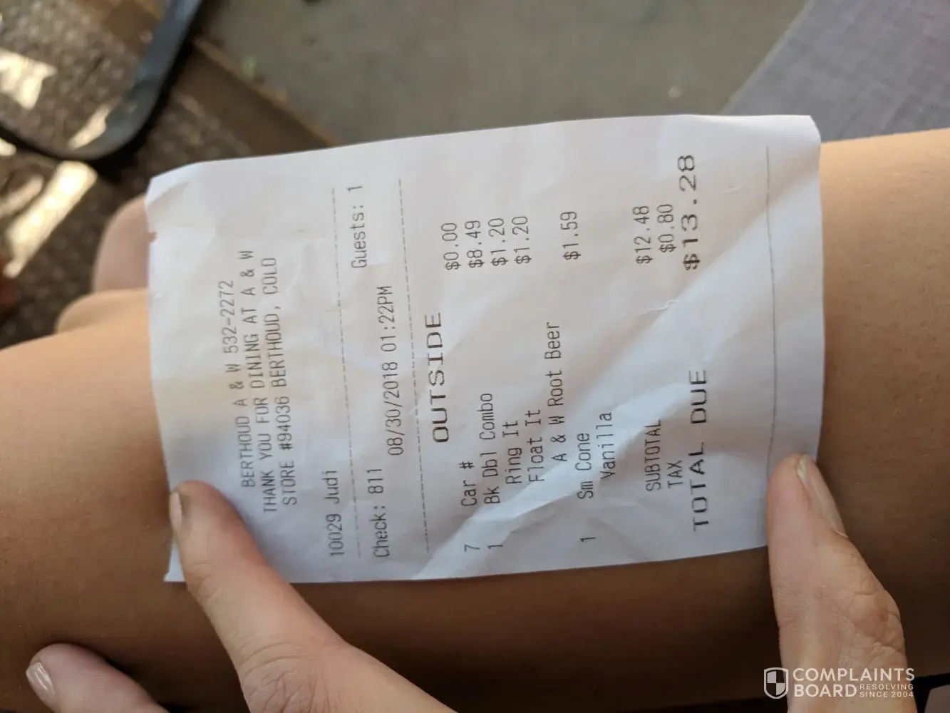 I was overcharged and waited about 15 minutes for my "fast" food. The bill was atrocious and the person at the window didn't even acknowledge the wait. I emailed customer service two times and it has been over two weeks. No email back like I asked for. I would like a refund because the poor service and overcharging. To be honest I feel like they are ignoring it hoping i will drop it. I wonder how many others who contacted a&w customer service have gotten the same treatment. I'm not going back until they resolve it.