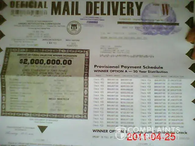 I was told also that I 12 million dollars and that it was confirmed and they even gave me a delivery date of December 31st and had sent me a letter asking did I want a camera crew to be there or did I want it delivered in privacy, it says also that this is the final judging paper and that you have to sign an affidavit which they send you and you sign it but its fake and claim that once a receive that then you will be receiving your two million dollars either in one lump sum of $1, 140, 000 or .66667 dollars a year for 30 years. This day has come and gone! You don't have to send them any money drama they call it a premium offers feed do for delivery if you are opting to order their junk jewelry, or a $15, 000 book of coupons to be used anywhere, and also a $25, 000 shopping sprees check.beware of the wording... You have an opportunity to win if you sign and return the pre selected winning number! Yes they are very creative but it is a scam you will receive nothing and I'm sure the post office old clothes participating in this scam.