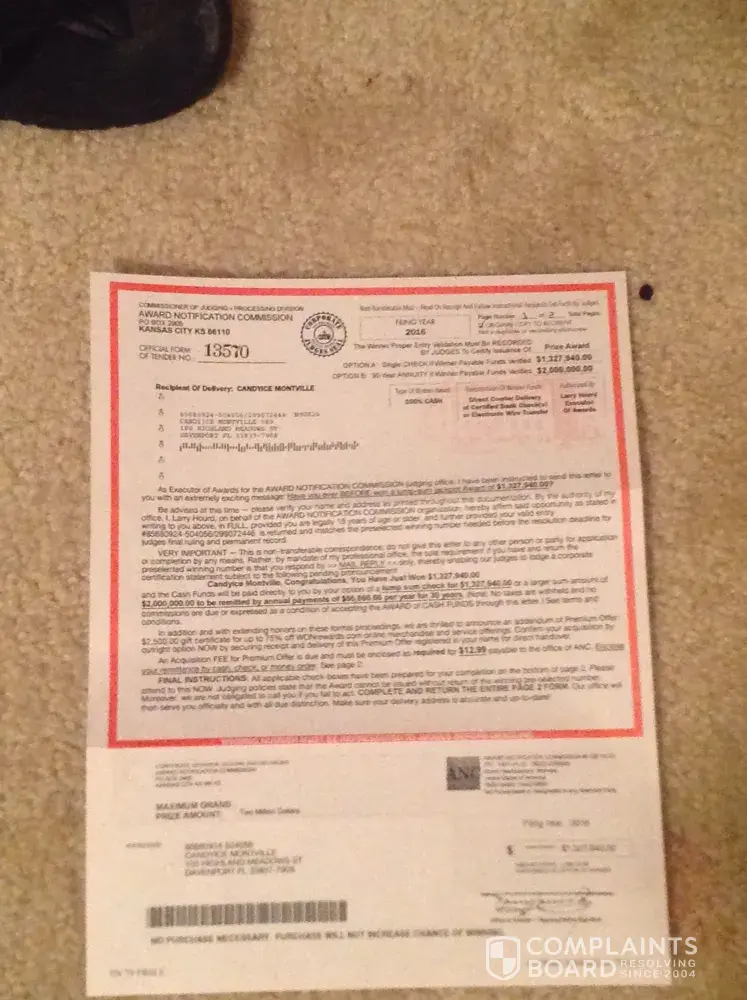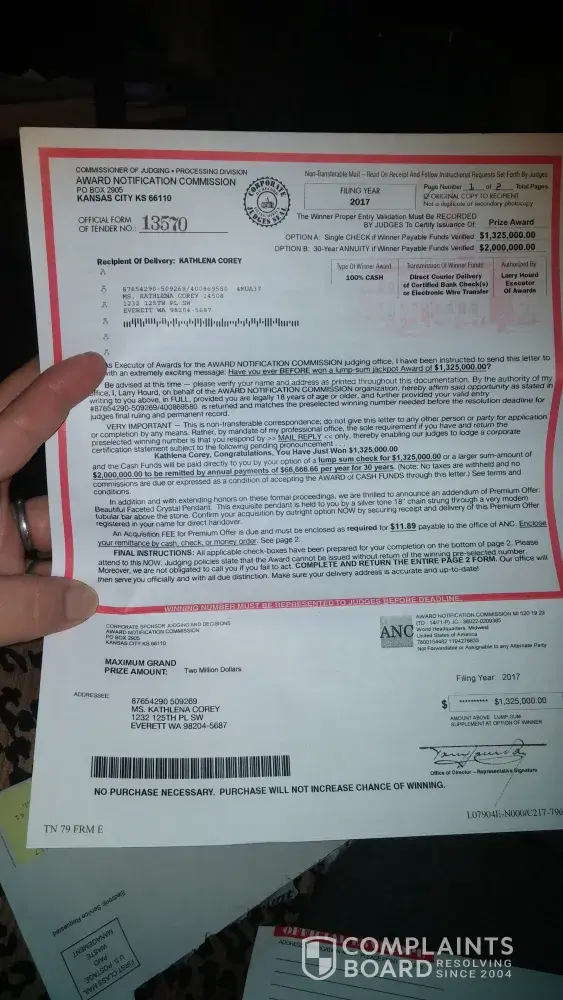 This game has been alive and well for 5 years I cannot believe that the Better Business Bureau and the government and the FBI have not caught onto this yet. ANC someway are retrieving names from publishing Clearing House. I think they are either vendors selling their stuff, getting people's names or they are sponsors.They send their award notification letters, we think its from a legitimate sweepstakes like PCH. I think that publishing Clearing House should do an investigation on all of their vendors and sponsors and find out where this is coming from it has hurt a lot of people, ruined lives and caused a lot of problems. There needs to be justice as far as this goes and I believe there should be a law suit class action against them and I am all in
