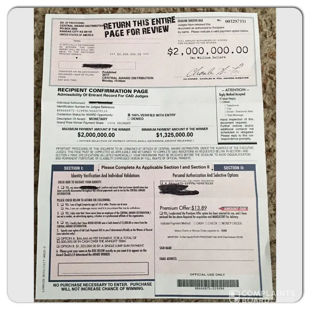 This company contacted me via mail claiming I won 2 million dollars I had the option to pay a premium offer of $11.95. Since there is no purchase necessary and a purchase does not increase your chance of winning stated on the paperwork that I still have, I mailed the paper back to them. A week later they said without the check the 2 million dollar offer will be void so I sent the check. Now I have another letter stating the same but wanting my signature and $17.89. Don't fall into this scam. You can contact me s at [protected]@gmail.com
