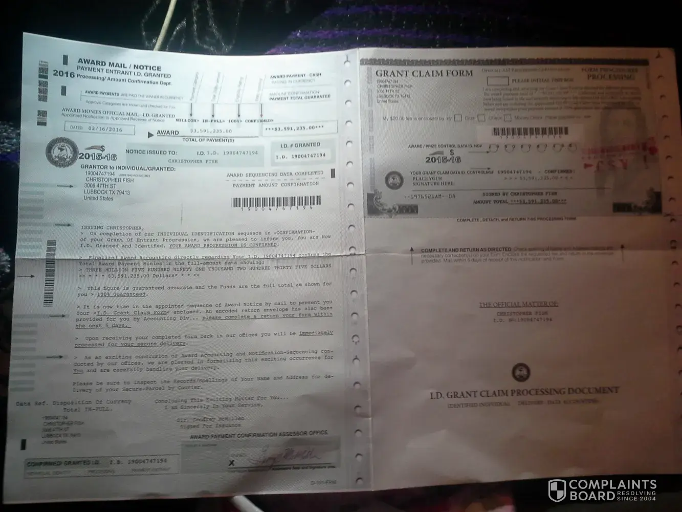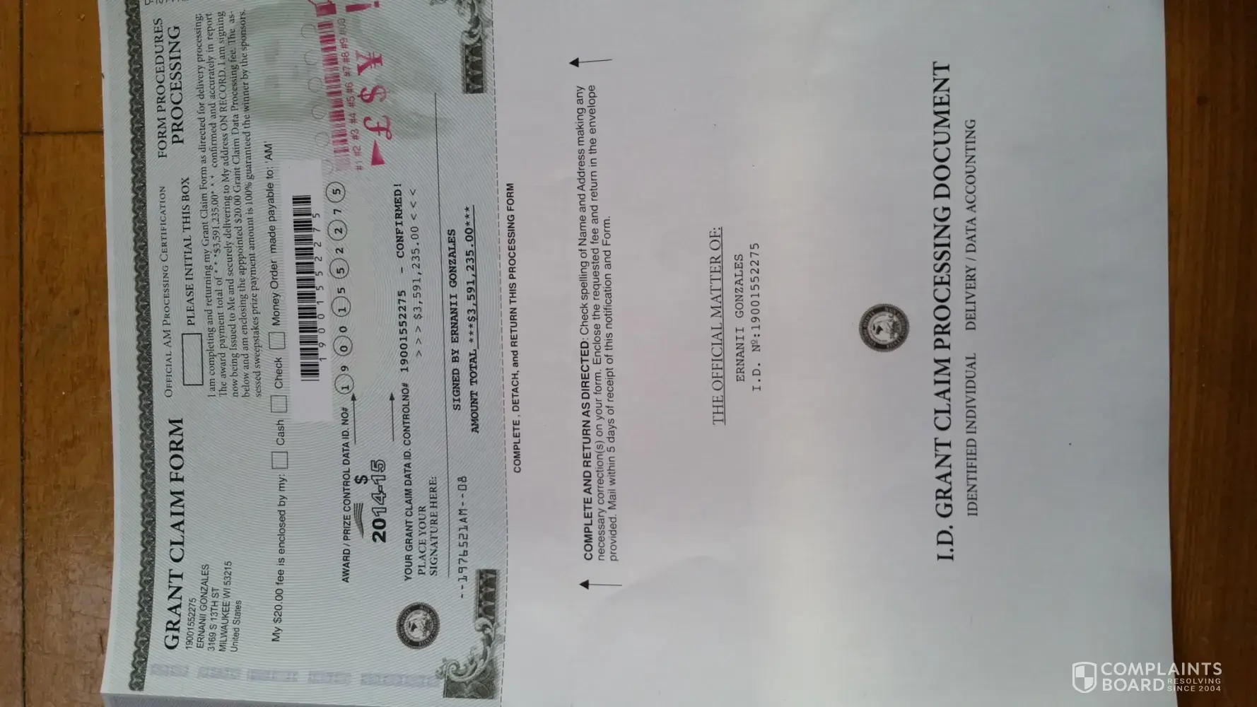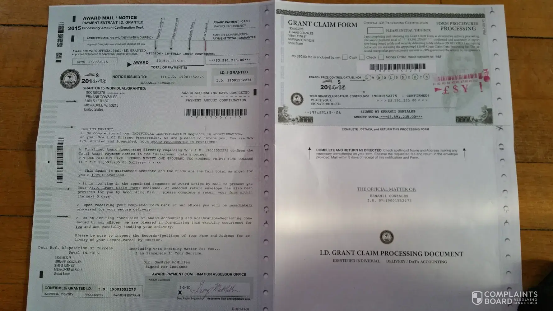 My roommate recieved a letter very similar to the ones described from a Award Processing Center in a PedEx envelope. It requested a $20.00 processing fee and the return of the certificate sent, which was identical to the one shown in the photos above. The award amount was also for $3, 591, 236.00. I typed the amount from memory so I could be off by a few digits. However, it is the exact same amount that another complaint for a ficticious < 3 million dollar award.