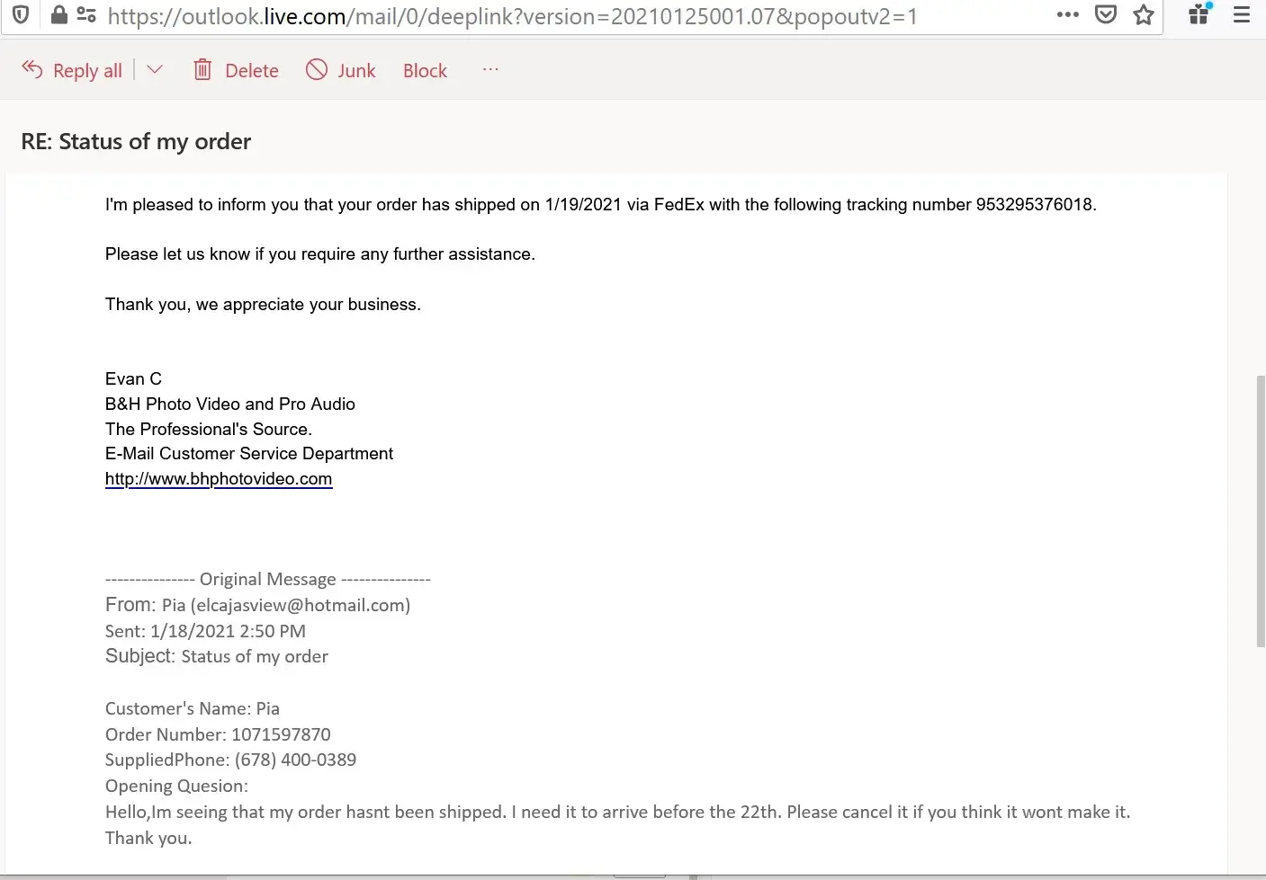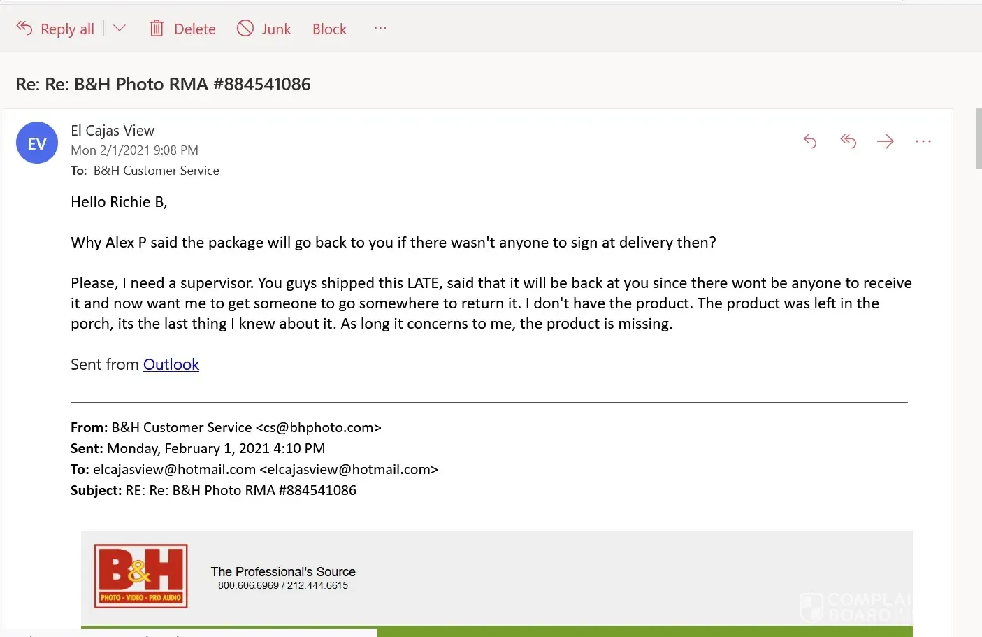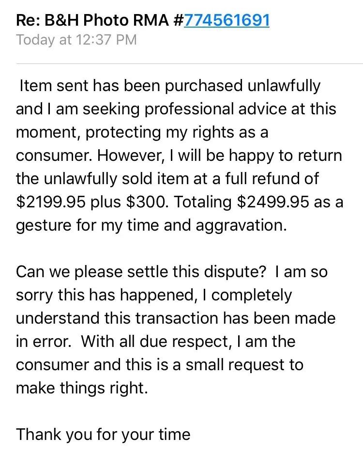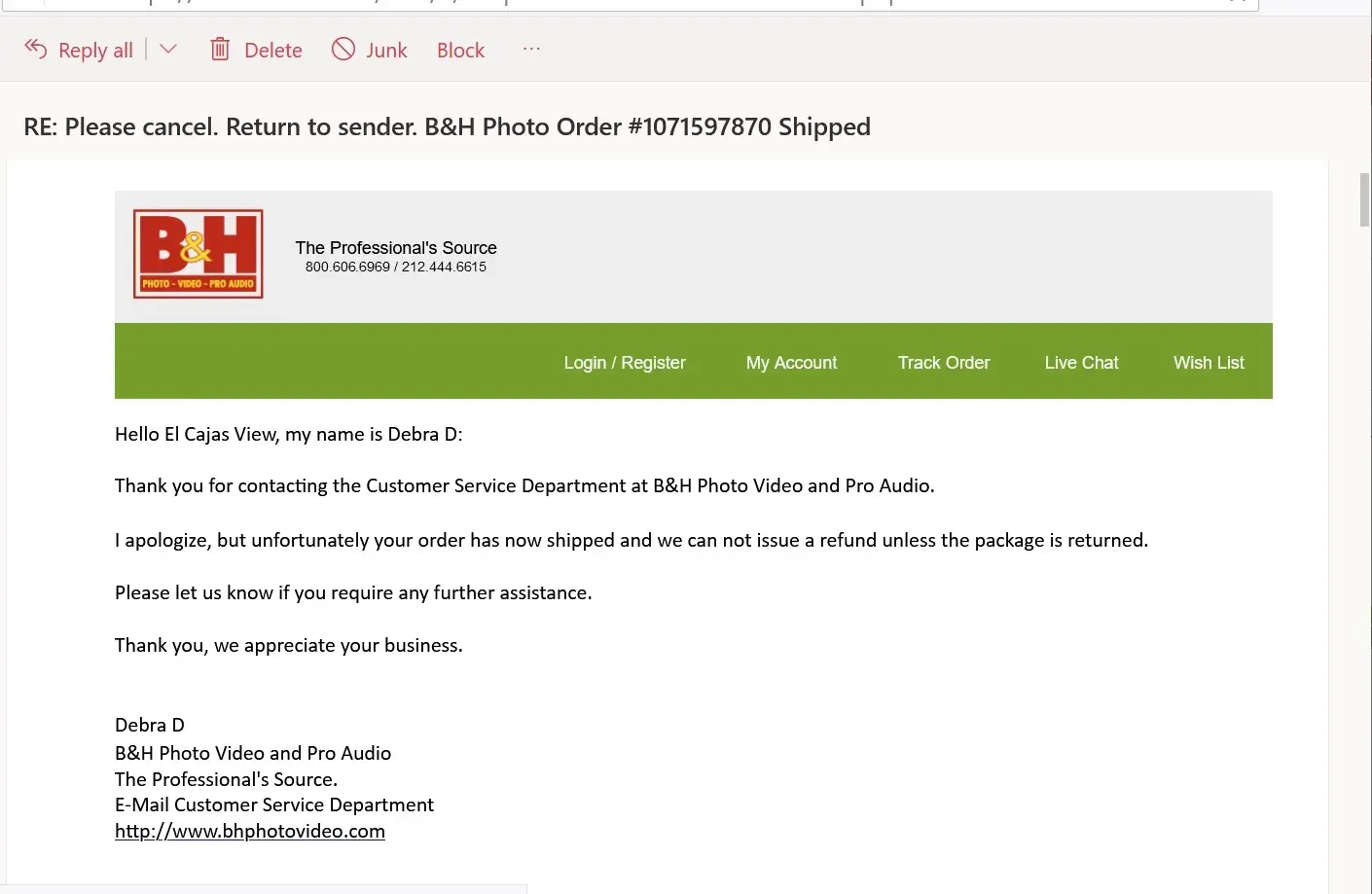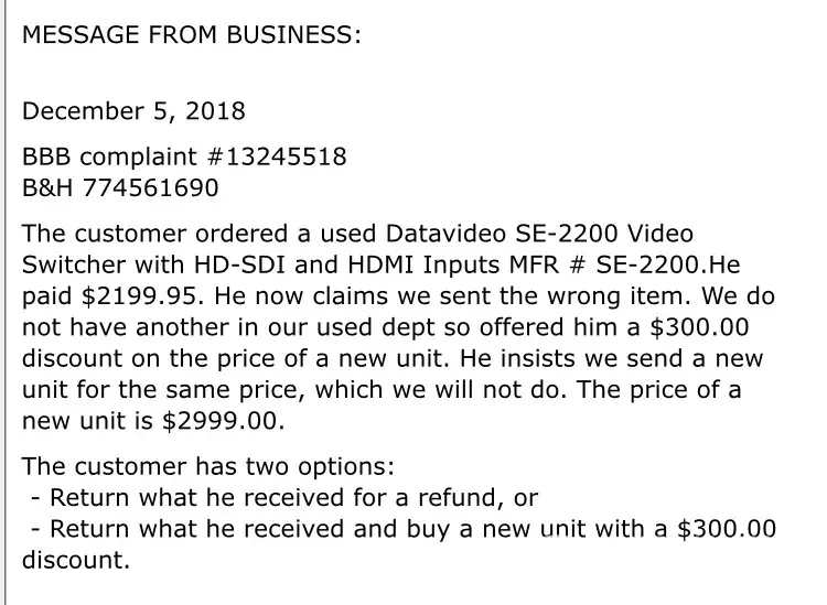 B&H has been in business for 50 years, and we believe our commitment to honesty with our customers resonates in everything we do. We would never intentionally mislead a customer, blame, or make a customer feel they were at fault. My role is to advocate for our customers and not to try and spin things to protect our company. At any point if you would like to discuss this on the telephone I would be glad to speak with you. When there is a situation such as the one you brought to our attention I do all of my due diligence to find out exactly what happened. There is no winner in these situations and as the customer you have the ability to spend your money where you think you should. If I find what our customer is telling us is correct I will do what is right and not worry about any possible financial loss to our company.