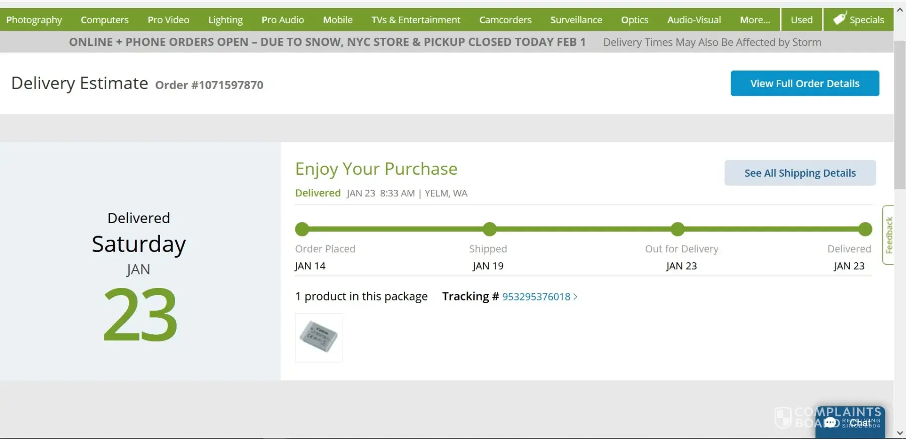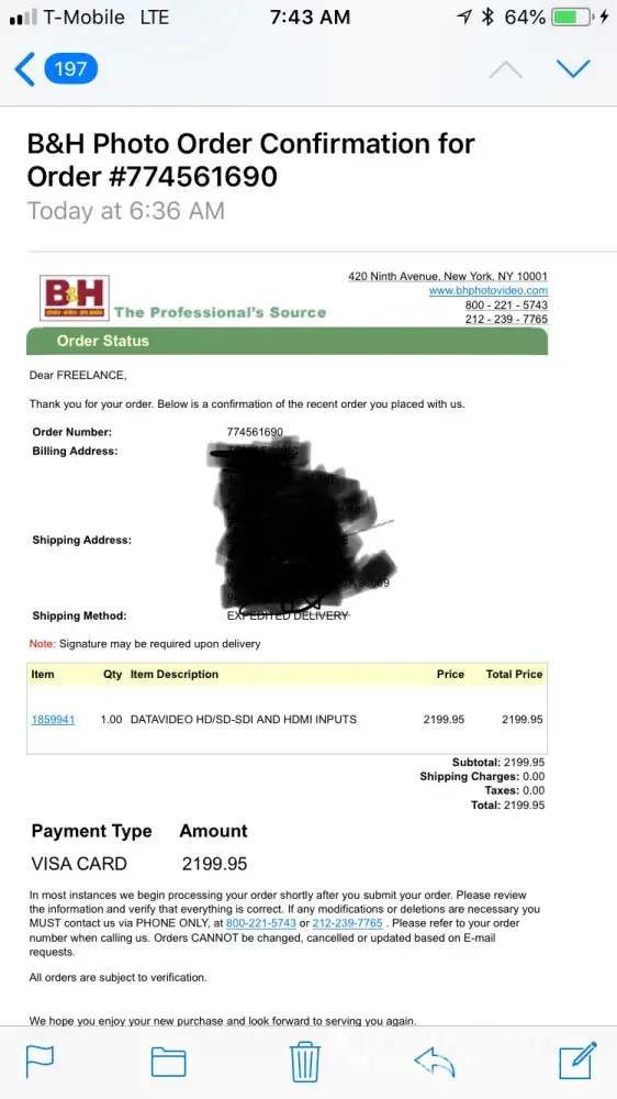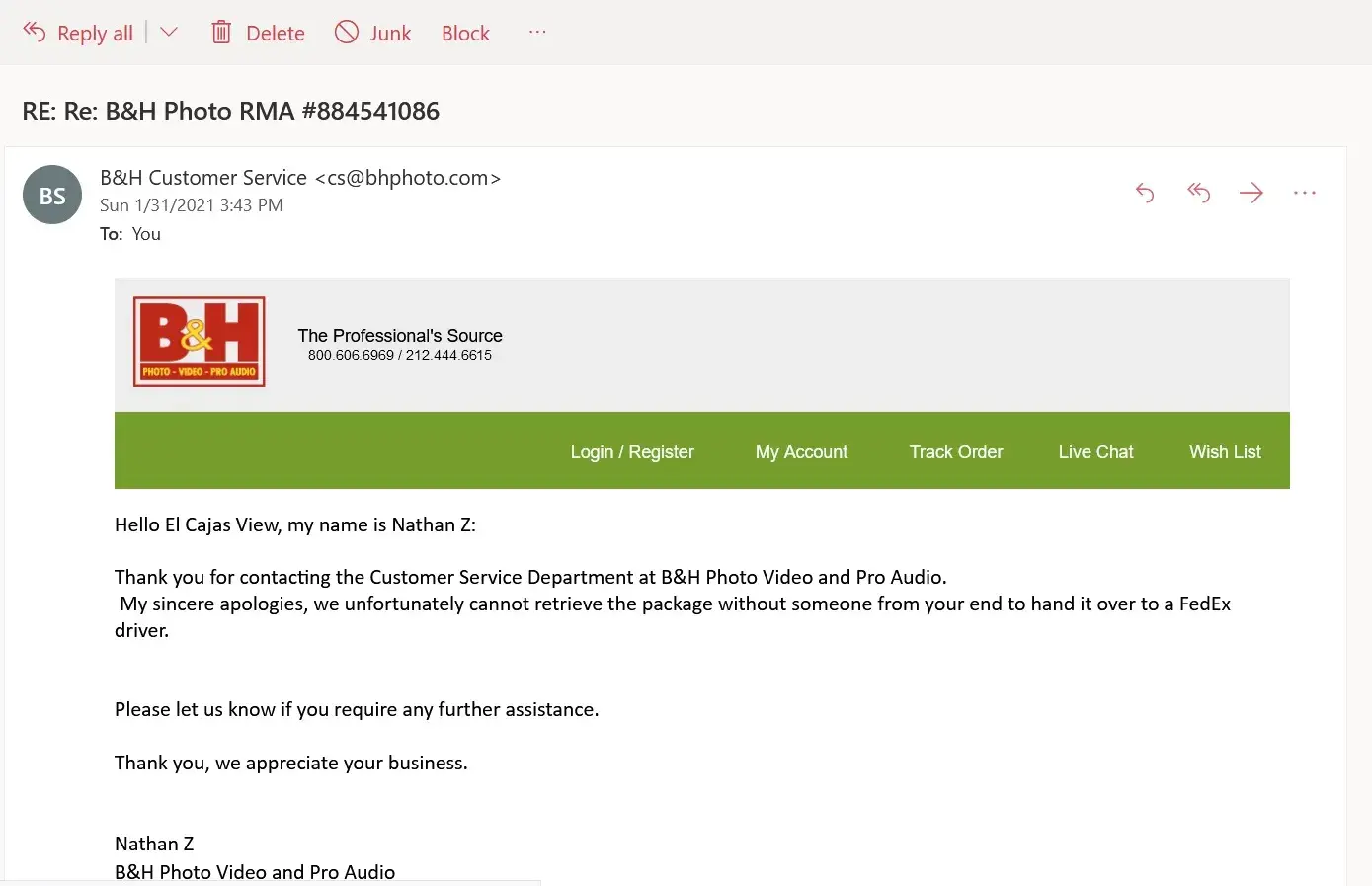 The fact that B&H ships via FedEx makes the entire experience awful. FedEx lied about attempting my delivery (I watched the truck drive right past our front door), then when I called and complained, my B&H package has magically been delayed FOUR MORE DAYS. There must be no fear of recourse or management at FedEx. My business has spent nearly $8000 in the last 12 months (between 2 accts) at B&H and FedEx is makes each experience awful. Amazon sells everything B&H sells, and it never comes via FedEx, so moving fwd, I'll be parting ways with B&H. It's unfortunate, but the DELIVERY is the MAIN PART of a transaction.