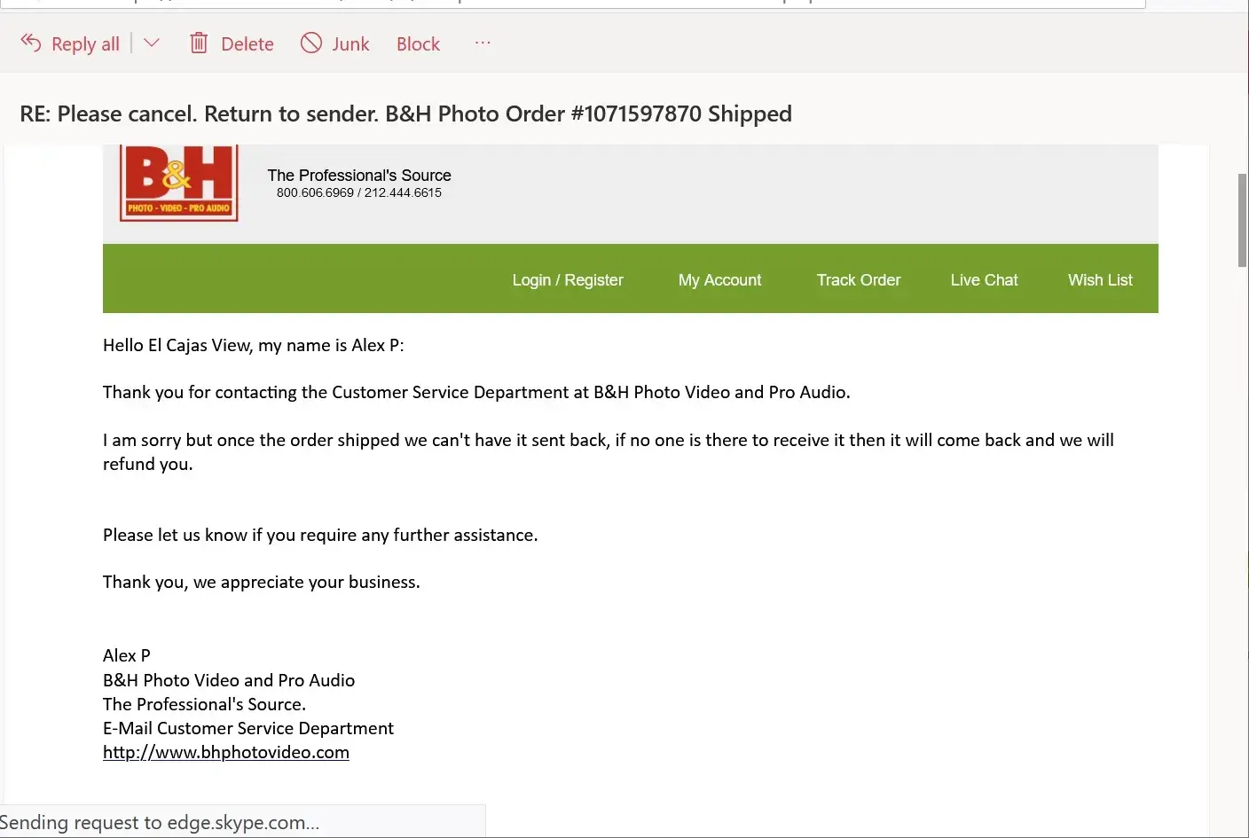 Desired outcome: Cancel order, refund me so I can order elsewhere. NOT buying from B&H because of this.