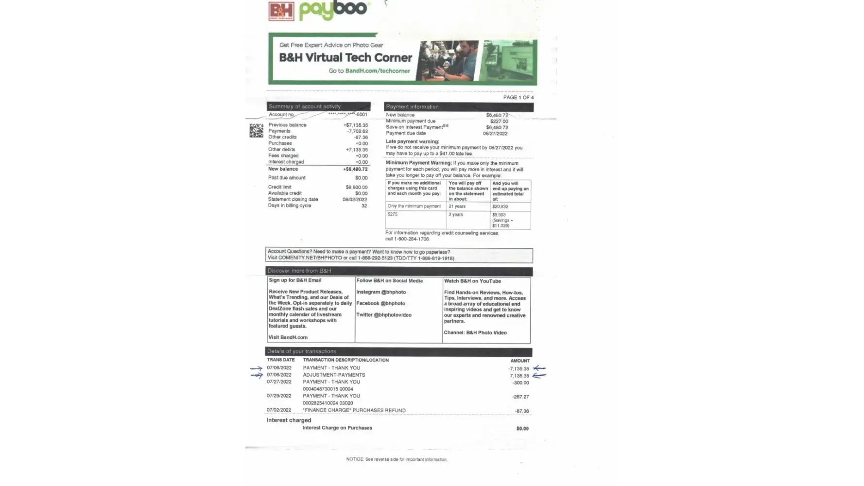 When I tried to pay off my credit card balance of $7,135.55 in full, B&H Payboo / Comenity Bank acknowledged receipt and then rejected the payment (see attached photo showing payment of -7,135.55 and "adjustment" of 7,135.55.)