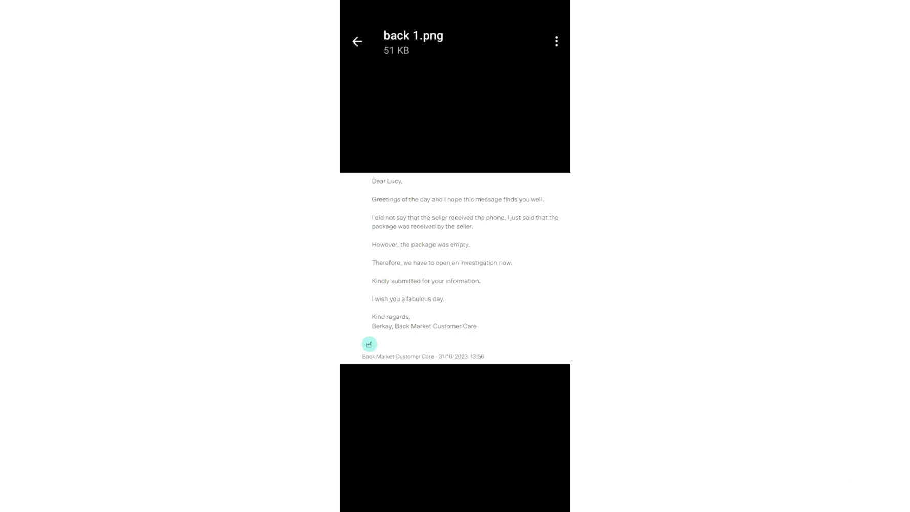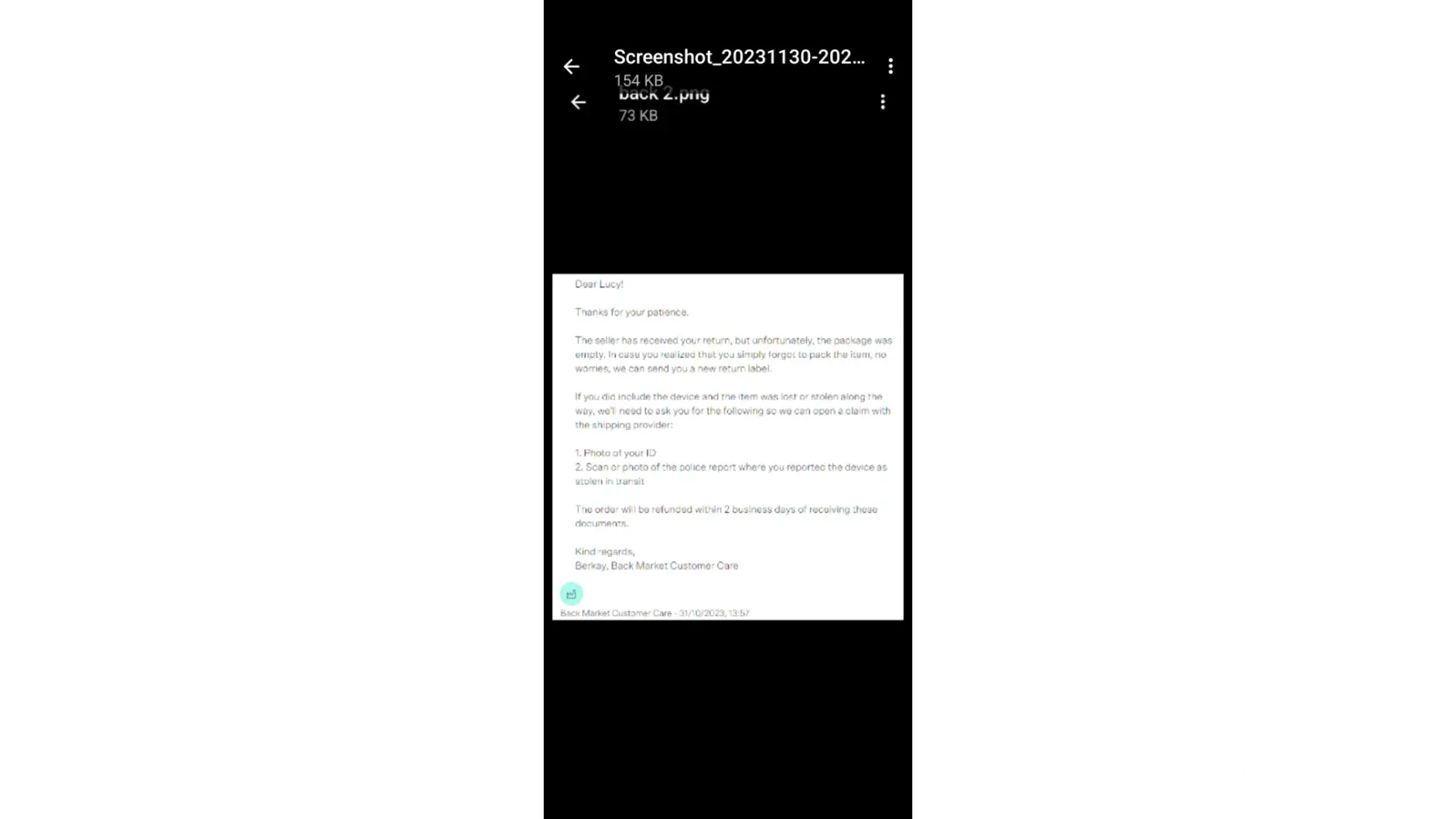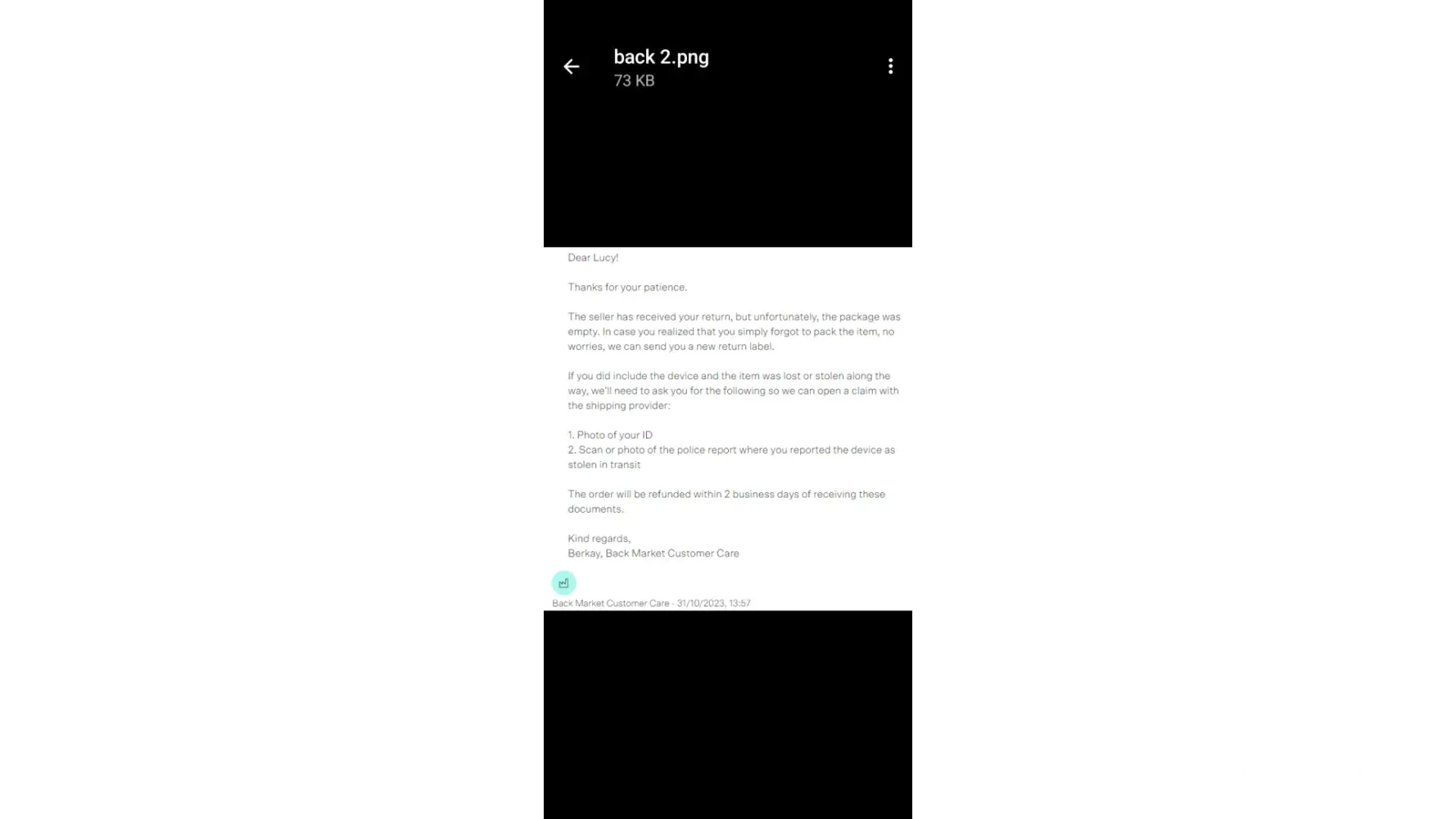 My daughter ordered a phone from back market order number [protected] that didn't work after 2 days, was returned on the 25th of October 2023 and initially back market stated that they had received the phone back and stated they would repair, replace or refund, replied again on the 31st and stated there was nothing in the package, they then asked us to send in a police report and stated when they receive that we would get a refund after 2 days ( another lie ) they have sent another message again today 30/11/23 stating they want a police report ( already sent ) proof of handover, id, and statement of payment, it's just one thing after another and 5 weeks later, I think they drag it on so you get fed up and give in, I the parent bought the phone for my daughter for £210.09, so have lost my money and still don't have a phone, the company is probably ok unless you have a problem, can't call them can't do a live chat just have to wait for days on end for a reply.