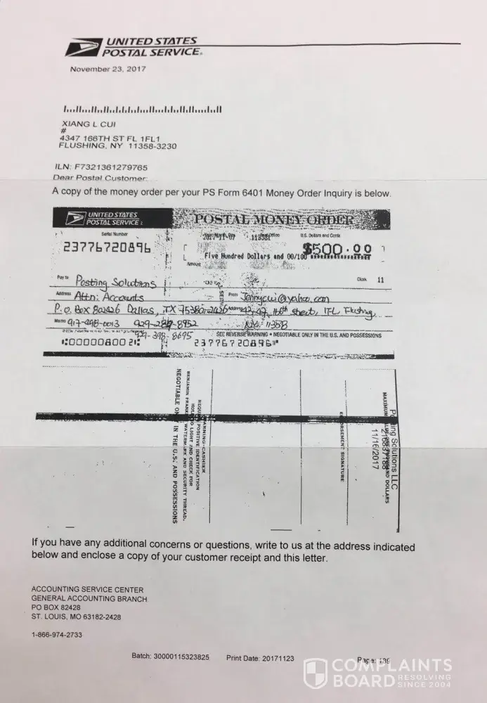 I was sent $500 value money order in 11/09/2017. And u guys cashed on 11/16/2017. But I still did not get the credits. I was try to call this number [protected] and sent several email to them, but still did not get right answer from backpage. My email address is "[protected]@yahoo.com" And phone number is [protected]. Pls contact me as soon as possible. Thanks