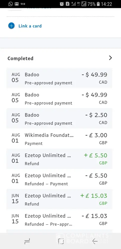 I had used my PayPal account to pay some amount to be too.i.e. approximate 2 dollars. And while doing the transaction I did not check the box which is meant for saving my PayPal account for future transactions. After completing this single transaction inadvertently I touched the payment option again on the touch screen and automatically money got deducted from my account which is not supposed to be the way as I did not save my account details for future transactions and badoo must have prompted to login to PayPal again. By this 2nd payment without my consent I got furious and I was trying to go back to home page and again inadvertently touched the screen where there was payment option, again not prompting me to login to PayPal.