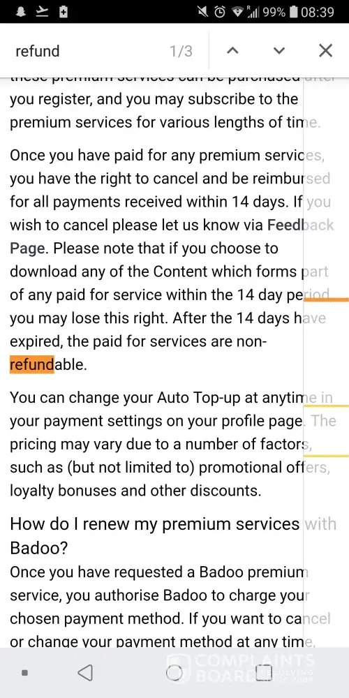 Let me share my experience i had with badoo today. I was using badoo on my iphone when the window came up offering me badoo premium. I have closed the widnow but to my surprise the next widnow poped up saying i just purchased life time badoo premium (119pounds) ;O. I was in schock coz i did not agree to that. I've contacted them as soon as possible but all they did was hide behind their no refund policy. After replying to my emails twice then they must decided to just ignore me coz i did not hear from them any more. I understand there may be no refounds if u intentionally buy something but i did not wanted, the website does it for you. Seeing other posts im not the first one to experience this. I may be taking it to the small claims court.