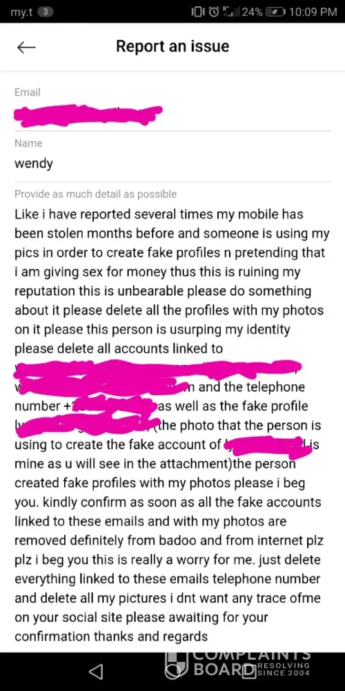 please note that i have been desperately trying to contact you via email and on fb my badoo has been hacked as someone stole my phone some months ago and i have been advised by friend on badoo that the hacker has been creating accounts on badoo with my photos also i please request you to check your email [protected]@badoo.com as well as your fb account i have sent you all relative details there together with my email details etc this is becoming highly prejudiciable for me as that person is usurping my identity please do something about this! in your email and on ur fb messenger i have sent all the relative details thank you