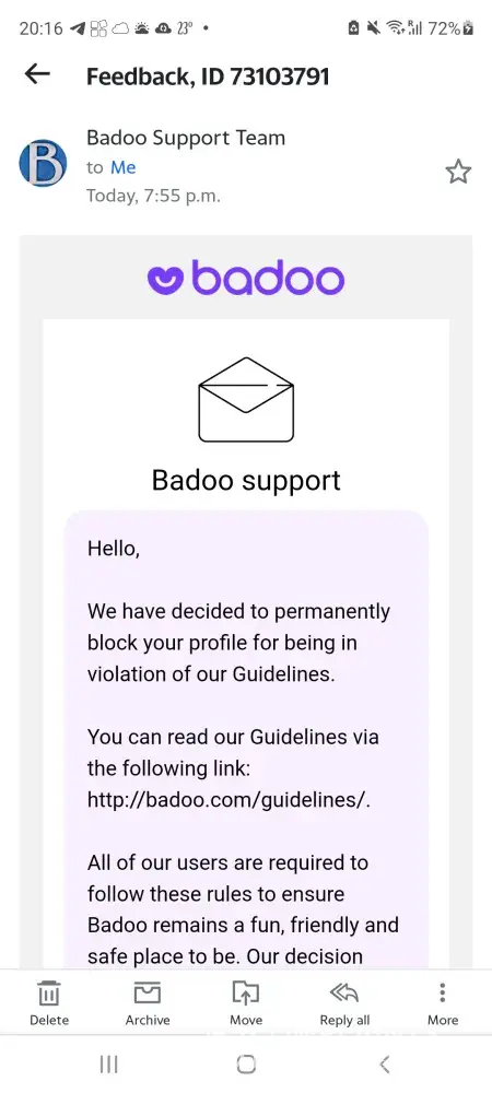 Badoo has wrongfully blocked my account permanently. They accuse me of violating their terms even though I am aware not.I have been a victim of harassment, character assassination and discrimination. I was their client for many years paying a whole lot of money. I am also a Tinder client and I have never violated any terms but reaching out to other people. It's high time to boycott Badoo there shouldn't be any dating site as despicable as that. When I wanted to report my attackers and send evidence in form of screenshot of the conversation I wasn't allowed to do that. So it's quite interesting how Badoo must have allowed some other people to send screenshots as proof of conversation. There is no way that copy and paste can possibly be considered as permissable evidence.