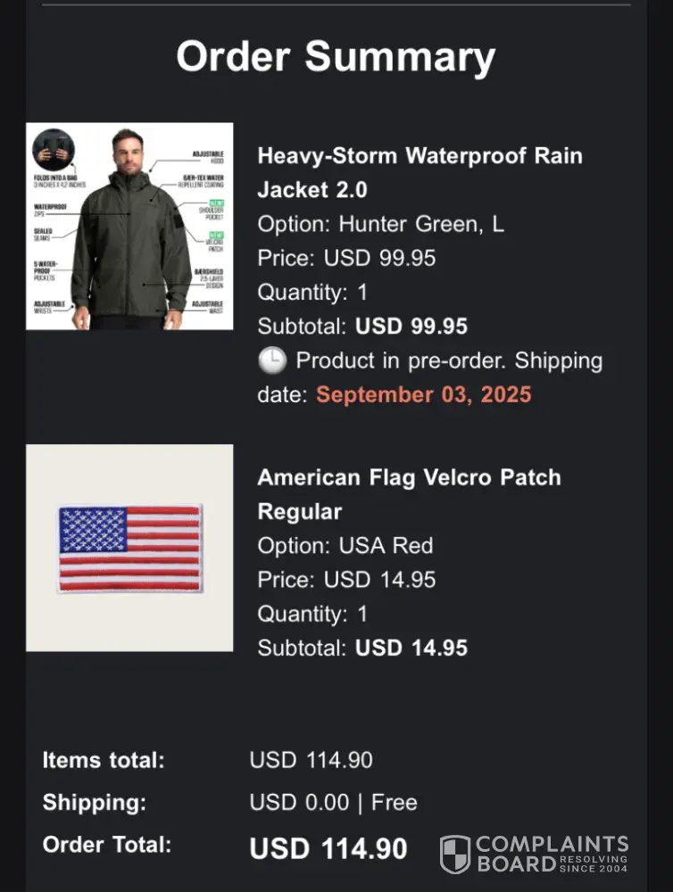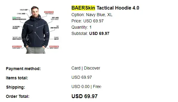 I ordered the hoodie and rain jacket from Baerskin Tactical on November 14th 2025. I did not get my order in the time frame that I was told which is 2-9 days after order confirmation. So I contacted them to cancel my order. I was sent an email stating that one of my items was a pre- order which they did not inform me of this when I placed my order. I once...