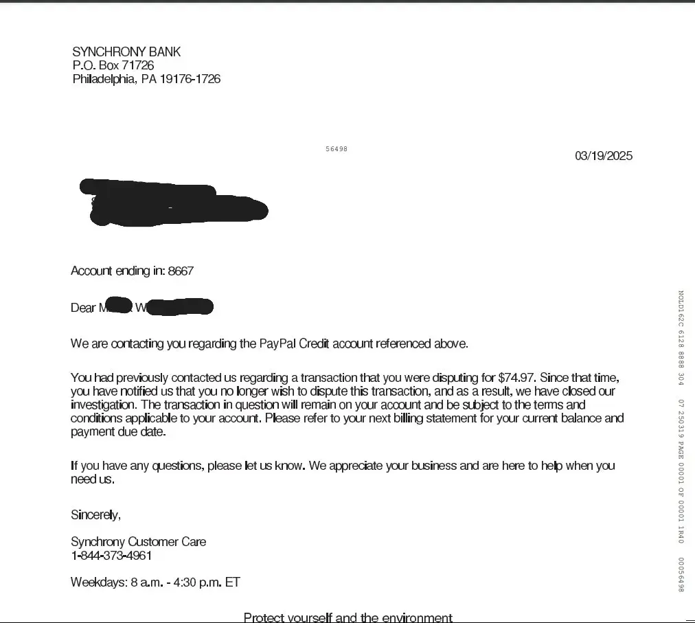 You are incorrect. I have just gotten off the phone with Synchrony Bank, the financial institution, and they verified to me they notified you digitally on March 19th that the disputes had been closed. I have attached a copy of one of the dispute closure letters to this message dated March 19, 2025. Please exchange my items for the correct size ASAP.