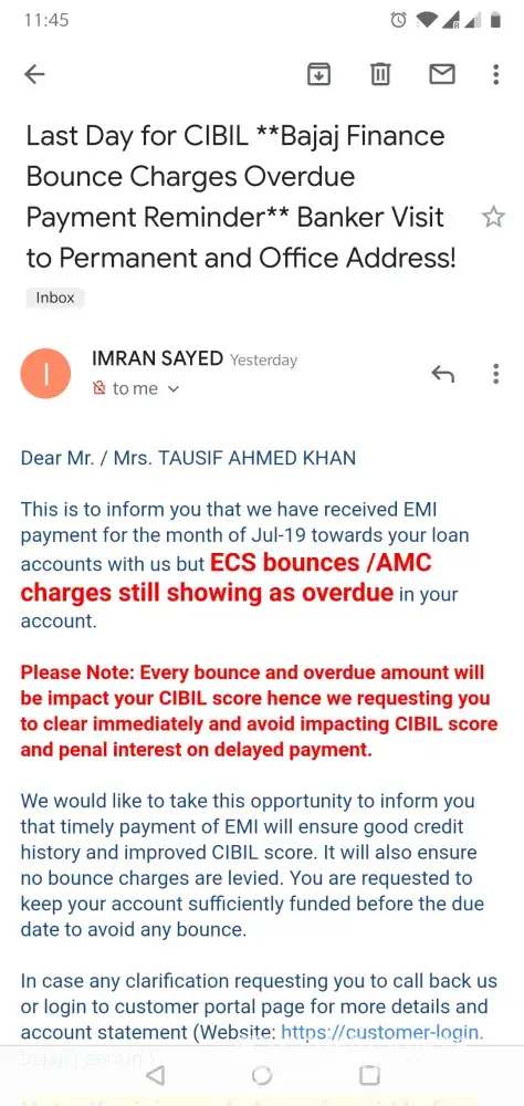Last Day for CIBIL **Bajaj Finance Bounce Charges Overdue Payment Reminder** Banker Visit to Permanent and Office Address!