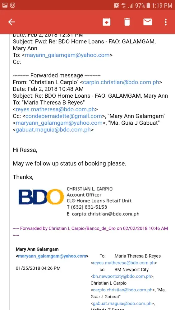 My sister, Mary Ann C. Galamgam who is an OFW applied for a home loan last year to BDO Newport Office and she appointed me as her Attorney-in fact. Last year we were able to complied with all the requirements and paid the necessary bank fees except for the 2018 Tax Clearance because Registry of Deeds doesn't want to issue one so we have waited until 2018. Last January 25, 2018 we received acknowledgment receipt for all the compliance that are lacking and confirmed on the additional documentary stamps tax due to Tax changes. I was able to confirmed in the e-mail came from Ms. Maria Theresa B. Reyes. However from then on I haven't received any information or what on the status of my sister's loan. No one from the group could even bother to reply my e-mail except to Sir Christian Carpio (who has giving false hope). I have been calling Ms. Reyes but not one did she bothered to answer my call or e-mails to her. Please help us. Give us at least verified information on the status of my sister's loan or at least give us the waiting time.