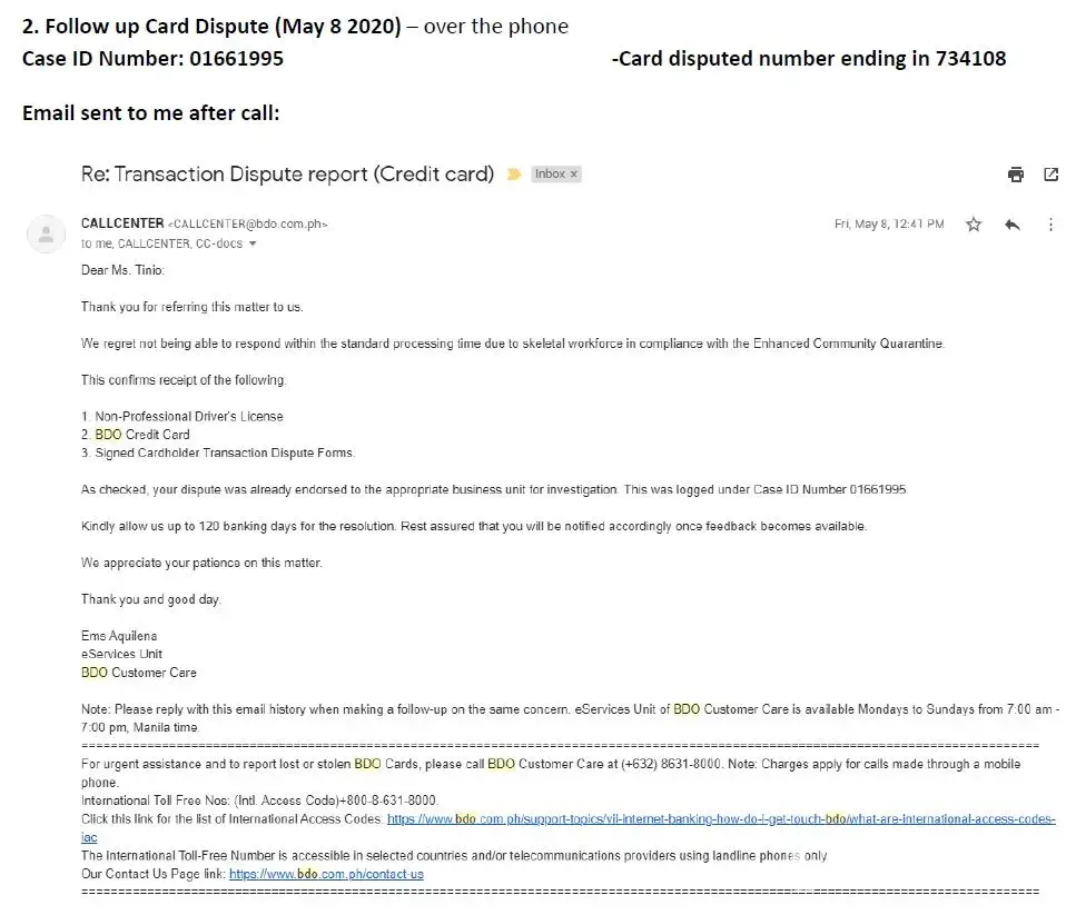 I received a follow up mail on May 8 regarding my dispute and informed me that it will take 120 banking days for a resolution, I do understand that major regions and cities are at lockdown at that time but I was quite surprise when we visited our local bank on June the report that I filed on april are not processed and so I filed for yet another dispute form which they said will take another 60 days and notified me that I will receive an email once investigations are done, 60 days and I still haven't received anything so I visited the bank twice on months of Sep-Dec but said that no one on the credits/investigators department followed up the matter,