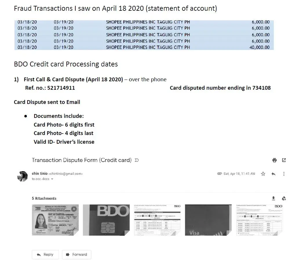 Last year April 18 2020 I saw fraudulent transactions on my credit card dated March 19 2020, this are all from shoppee amounting to 64, 000, I was shocked because no one contacted me about this and I haven't given a single permission to anyone, I contacted BDO immediately and filed a report and they have advised me to file a dispute which I did on the very same day (April 18 2020)
