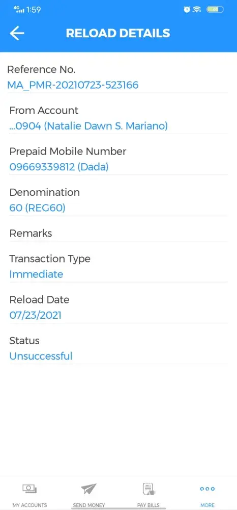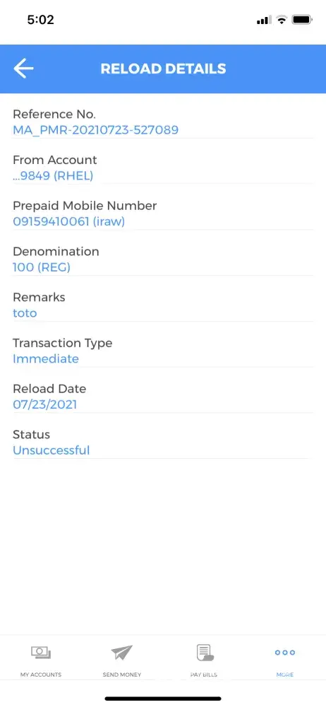 I have reloaded ₱100 prepaid load using your mobile app and when I thought I was gonna receive it, I didn't. I checked the status on Immediate category and found out it was unsuccessful but it DEDUCTED THE AMOUNT ON MY ACCOUNT. I TRIED RELOADING AGAIN BUT IT DEDUCTED THE SAME AMOUNT OF MONEY IN MY ACCOUNT AGAIN WITH NO NOTICE. NOTHING. Now I'm just a lowly office worker and ₱200 is a LOT for me.