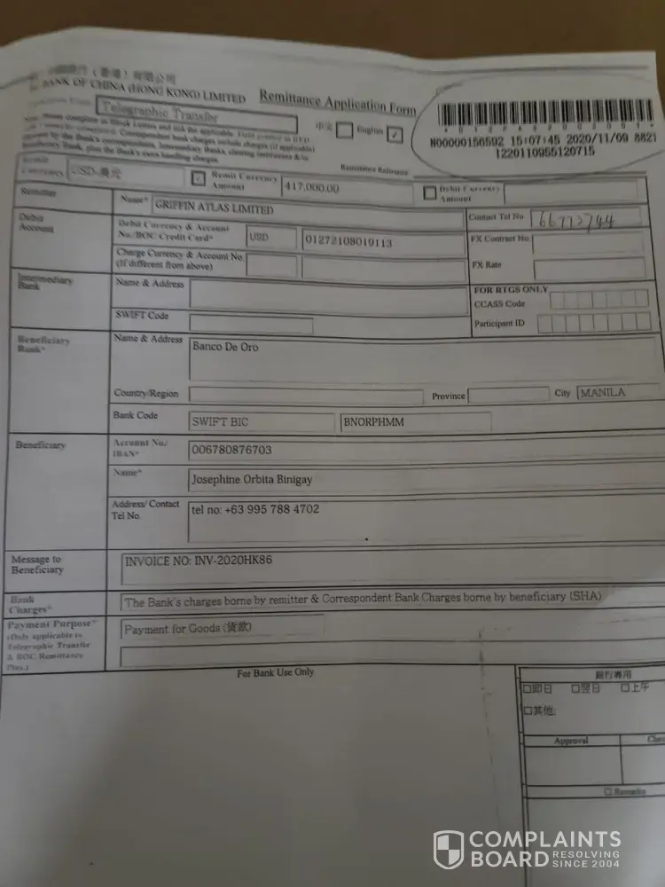 Issuing bank: Bank of China Hong Kong