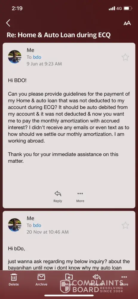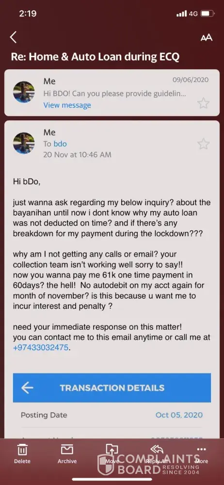 It started on the lockdown period whereas they were not able to deduct the Auto loan payment for 2 months from my account now I am being deducted with interest & penalty charges which is not my fault. However, due to this pandemic lockdown, I asked thru email last June 9 on how to settle those months that were not deducted from my account during the ECQ or...