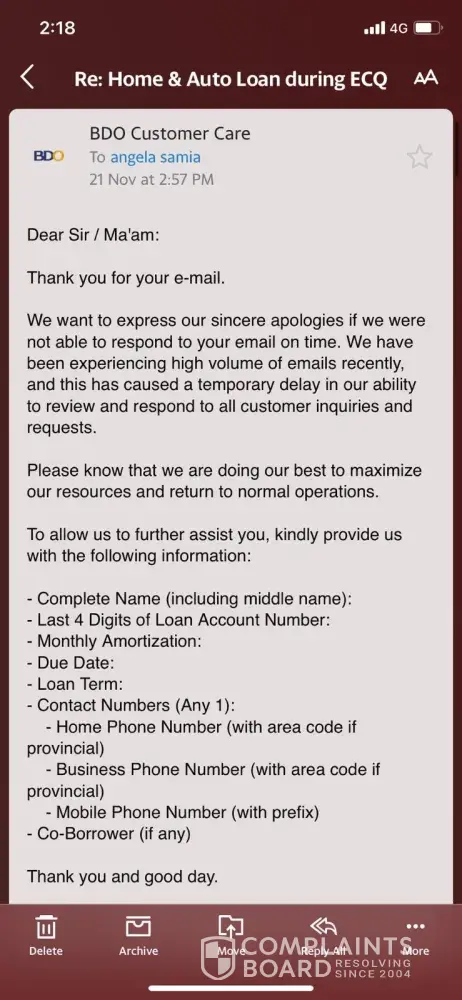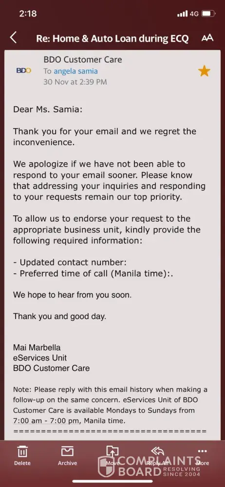 1. After my 2 email to Ms Jessica dela Cruz with NO REPLY, on Oct 1, 2020 @ 11:07am finally endored and informed Ms Manalili to assist us in our loan account.