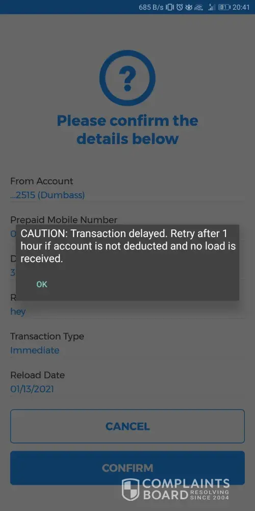 I made a transaction yesterday to load 1000 php on my number using my savings account. But the load did not push. I tried to wait until today but it never came through