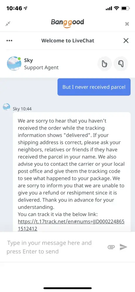 They are simply saying again and again the following - "All orders reported as delivered by shipping companies are considered delivered. Banggood cannot be made liable of non-delivery in this case."