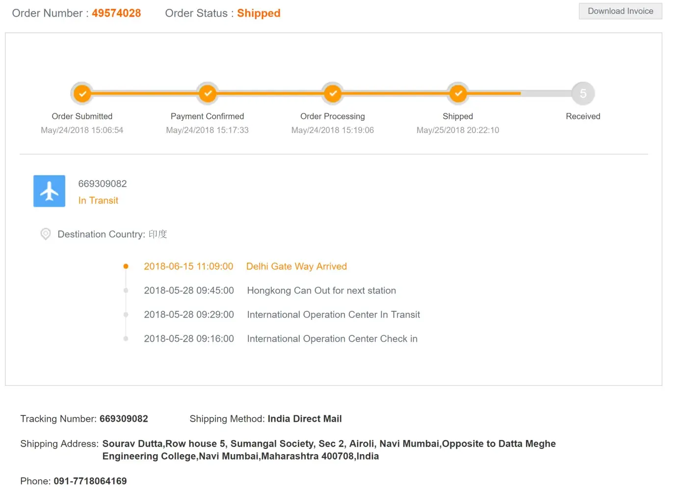 Ordered from Honkong CN warehouse. on 24th May 2018
