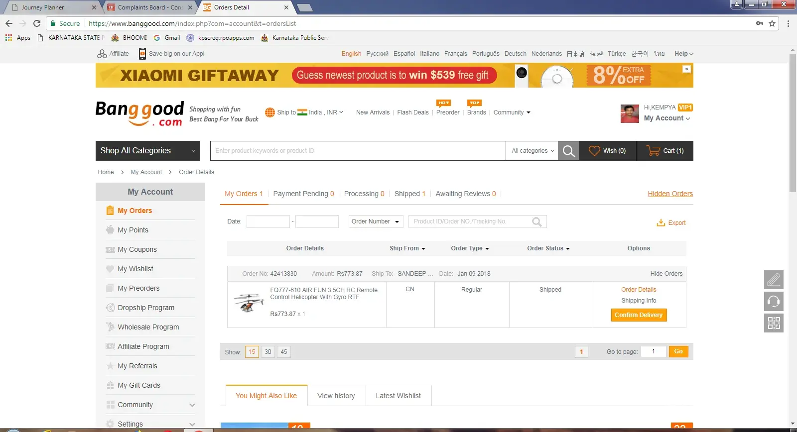 Reference to above subject I had boocked a helicopter on 09/01/18 to 19/01/2018 still not receved and it is showing in the website conform delivery I did not receved the parcel means why I have to conform the delivery