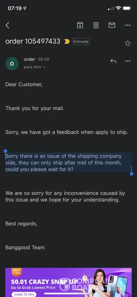 I've bought a product from banggood on blackfriday and they promised me a 1 week delivery service, when the day came I looked it up and realized that the product wasn't even shipped yet.