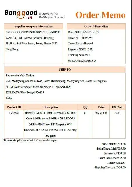 Banggood Order ID [protected], Product ID 159234, Product Name Bmax B1 Mini PC